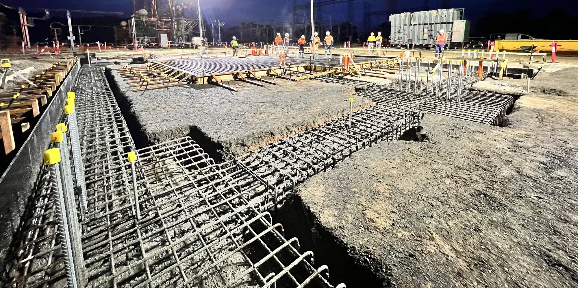 Our team was called in to complete the Form, Reo, and Pour package (FRP) for the new transformer’s foundation and the surrounding concrete works in the area. This included concrete foundation works (strip, pad, and transformer footings), multiple apron concrete slabs, an in-situ cable trench, a spoon drain, a strong slab, and a rollover bund.